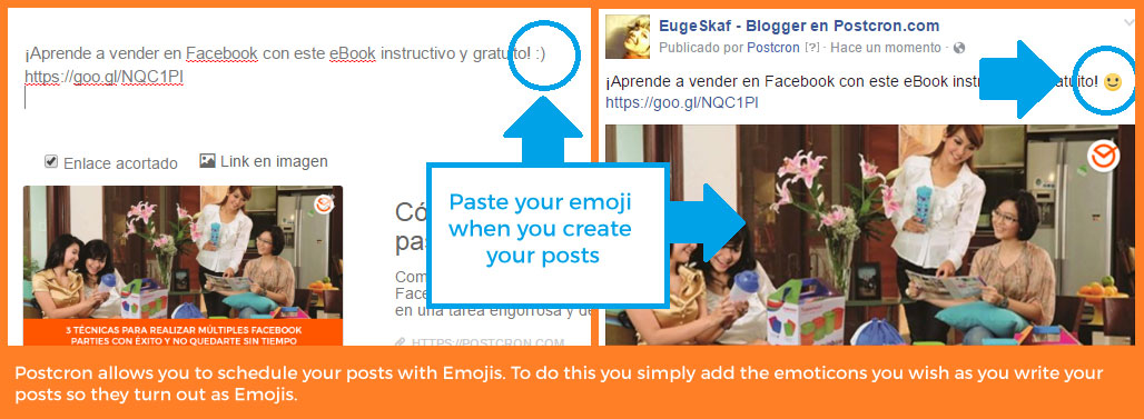 As you can see the power in Emojis is incredible and as many companies have demonstrated, you can also take advantage of them with your business. To obtain the maximum benefit I recommend that you schedule your posts with Emojis with the help of Postcron, so they are automatically published during the week or month. With this tool you can add emoticons as you write your posts, that will later be viewed as emojis once your post is published.