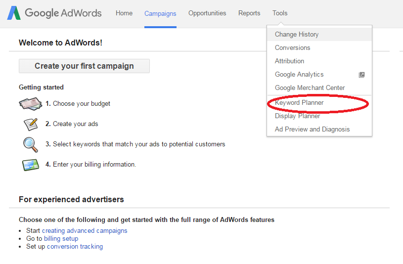 To use the Keyword Planner, all you need is a Google account. After you have one you must enter some data, such as your country of origin, hourly use and currency. Once you are finished with this step, the site shows you the option to create a campaign, but you can skip this step and go directly to the Keyword Planner, as shown in the image bellow.