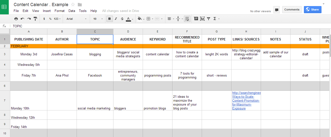 I hope you find my prior experience useful and that you are encouraged to create your own content calendar. Remember a calendar’s purpose is to get you organized, not stuck. It should fit the general marketing strategy of the company and be dynamic, it should be reviewed and optimized periodically (monthly) in order to achieve the goals set, either related to traffic or impact of social media channels, just to give you an example of basic matters to be analyzed.