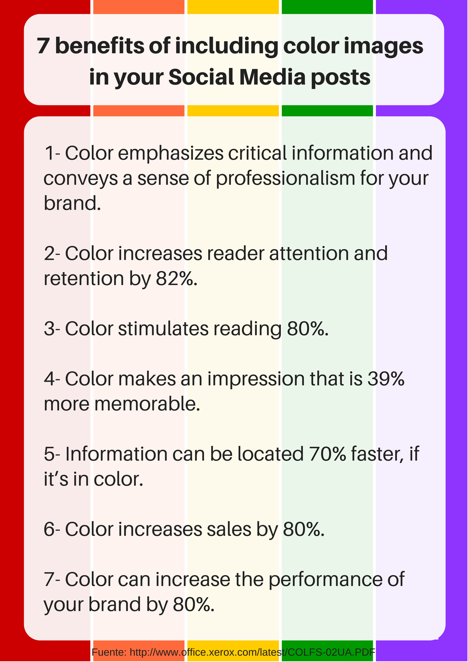 - Color increases reader’s’ attention and retention of information by 82%.