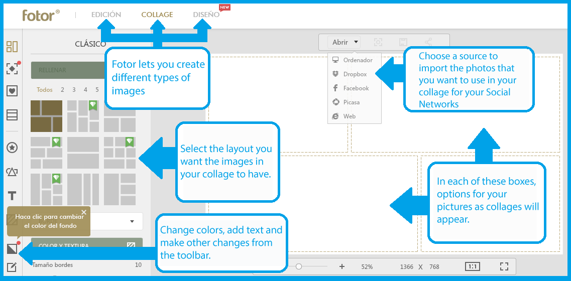 How to create images in collage? For this task I recommend another great online and free application: Fotor. It is a simple and complete tool at the same time. You can import images that make up your collage and accommodate them in the layout you choose. You also have the ability to add text, stickers and more.