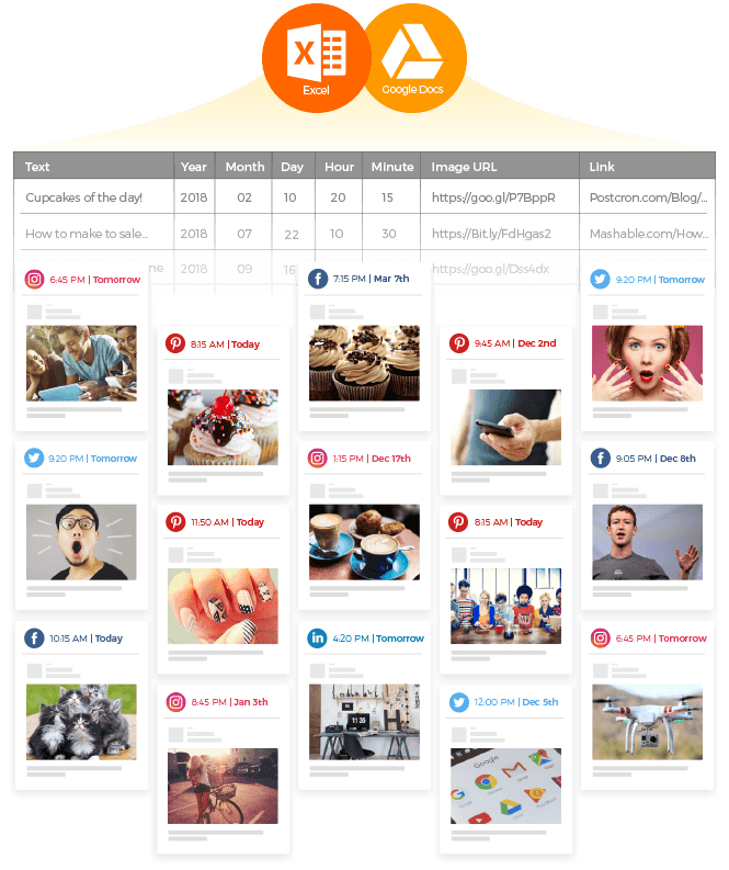 Just organize your content on a spreadsheet and Postcron will schedule it automatically. Super fast and easy!