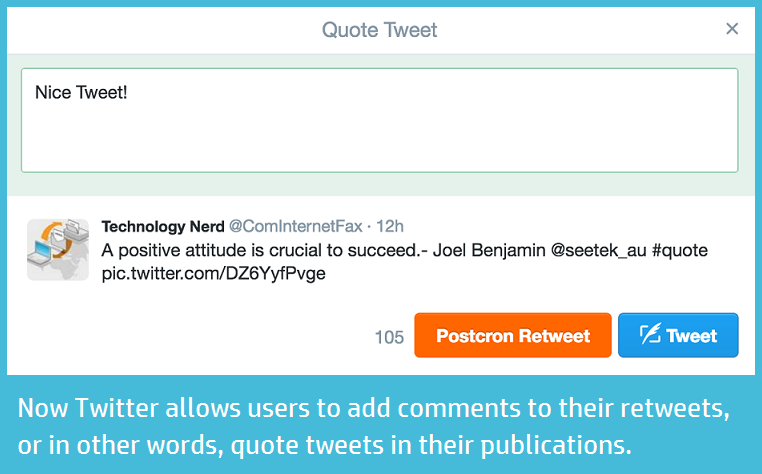 While this feature is already available, it seemed appropriate to highlight it since it was just recently implemented. It focuses on the possibility of commenting on retweets though the “Quote Tweet” function. So, every time you make a RT you can add comments to the publication, or share it in its original format.