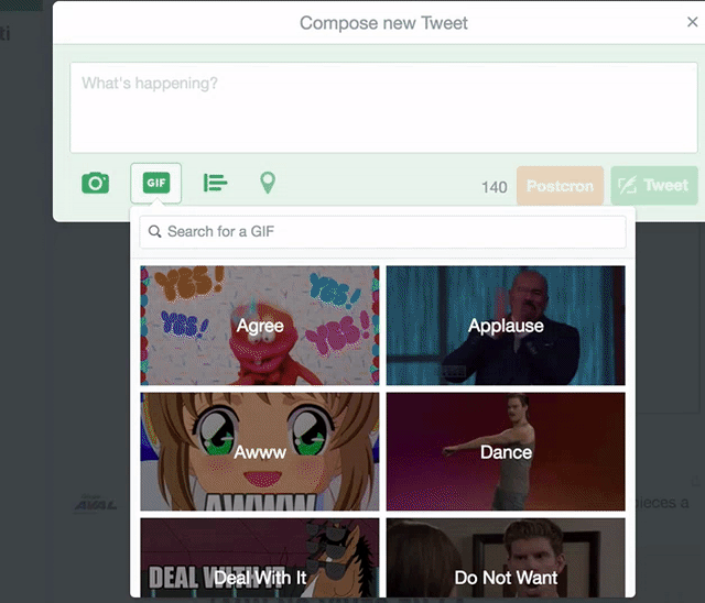 So, in order to utilize the Twitter GIF search, all you have to do is click on the “GIFS” button that you’ll see in the tweet editor. After pressing it, a window will pop up in which you’ll be able to choose the best animated GIFS, ordered by category, to enhance your publications with a touch of humor or visual art.