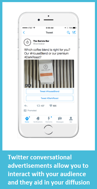 So in addition to the “promotional tweets” launched over the past years, now Twitter will allow you to create Conversational Advertisements. With these you’ll be able to interact with your audience through tweets linked to your brand in order to promote your hashtags, define your business and obtain information for your market studies.