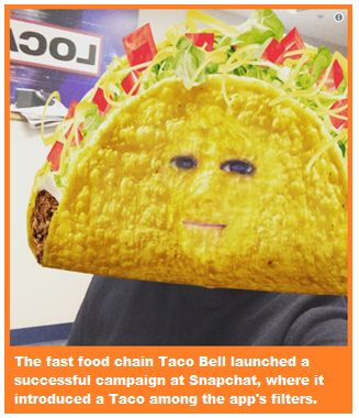 The famous fast food chain Taco Bell used Snapchat with style and sense of humor, using the technology of Augmented Reality Filters to promote their own products. So, the Filter “taco face” was introduce which people could use on their faces, as a comic mask.