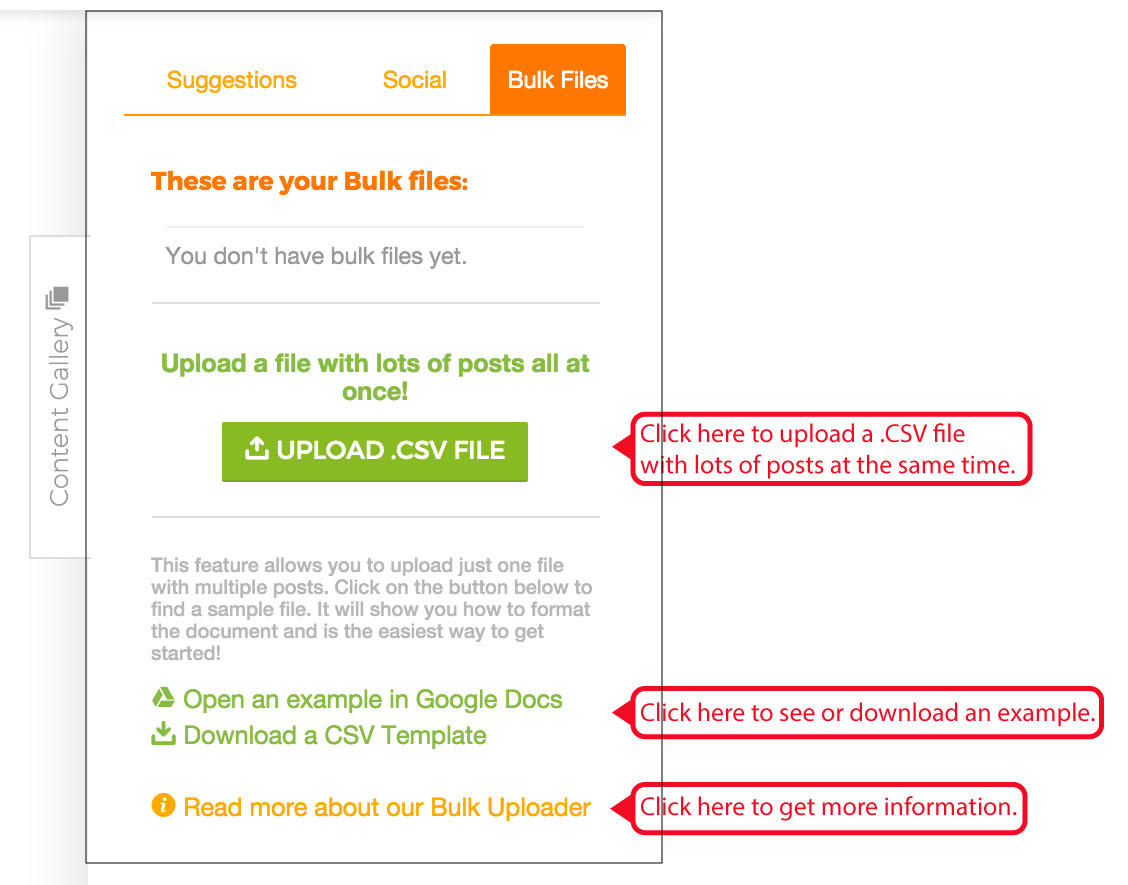 Finally, the Content Gallery lets you upload posts in bulk using a spreadsheet (CSV file).