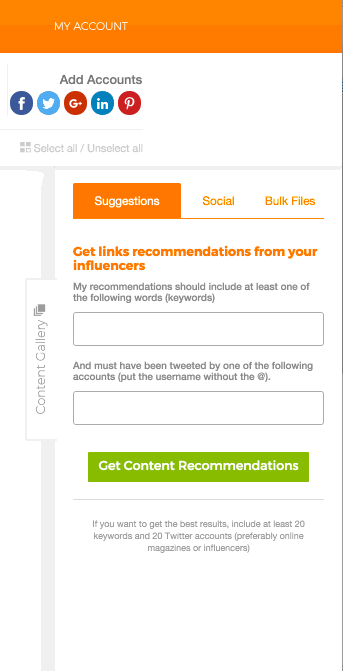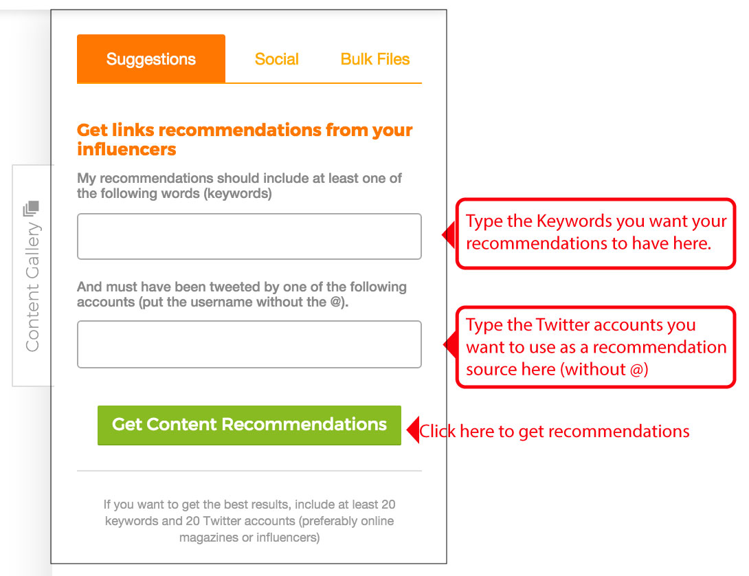 Once on this tab, all you have to do is enter keywords that are relevant to your audience. Then enter the Twitter accounts you want to use as a suggestions source. Then, click on “Get Recommendations“.