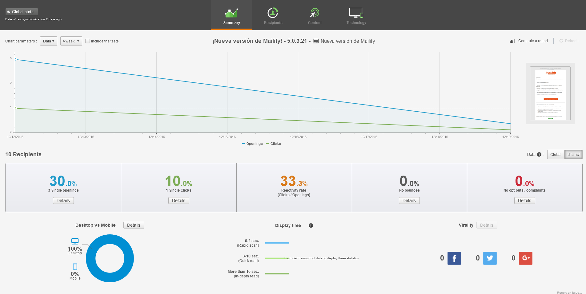 Your application needs to be integrated with others to help you while you are creating. Thanks to the integration with Google Analytics you can find the impact mailings have regarding inbound traffic on your web without leaving the application.