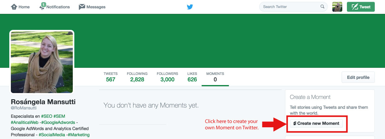 To create your own Moment, the first thing you need to do is go to your profile and click on the Moments Tab, on the top right of you account.