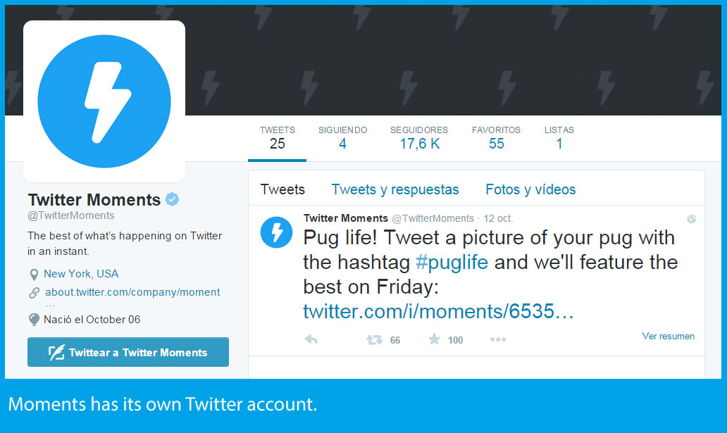 During the next weeks, all of Twitter´s users (starting with those who live in the United States) will see the new Moments tab on their personal accounts identified with a blue lightning bolt, as shown in the following image below.