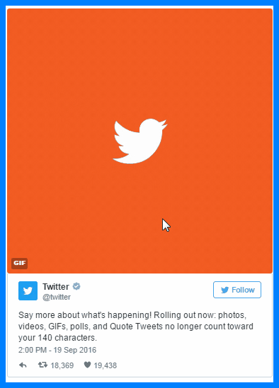 - Tweets With Multimedia Elements: Because of this update you can add images, videos, surveys, GIFs, Quoted Tweets or Direct Messages in your tweets, without reducing the Twitter character limit of