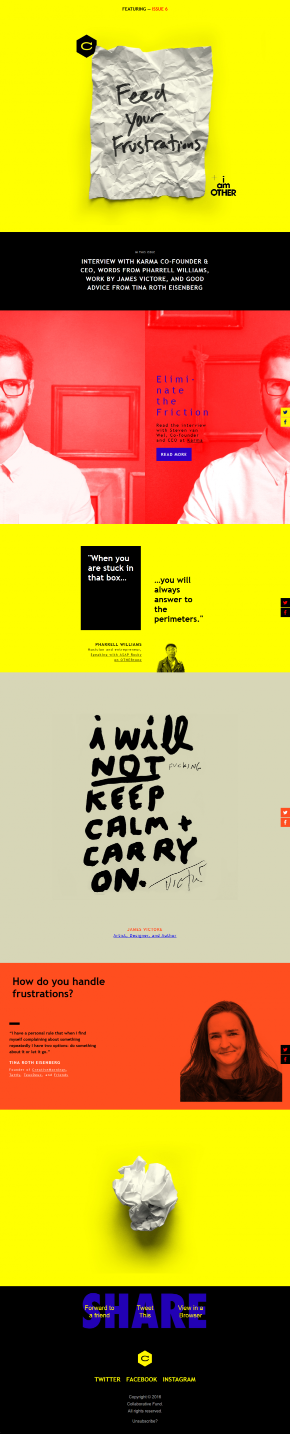 Collaborative Fund is a leading source of capital for entrepreneurs. This image corresponds to an email marketing campaign related to the company blog. The emotional is placed in the design, the colors and, above all, the text: “When you are stuck in that box, you will always answer to the perimeters”.