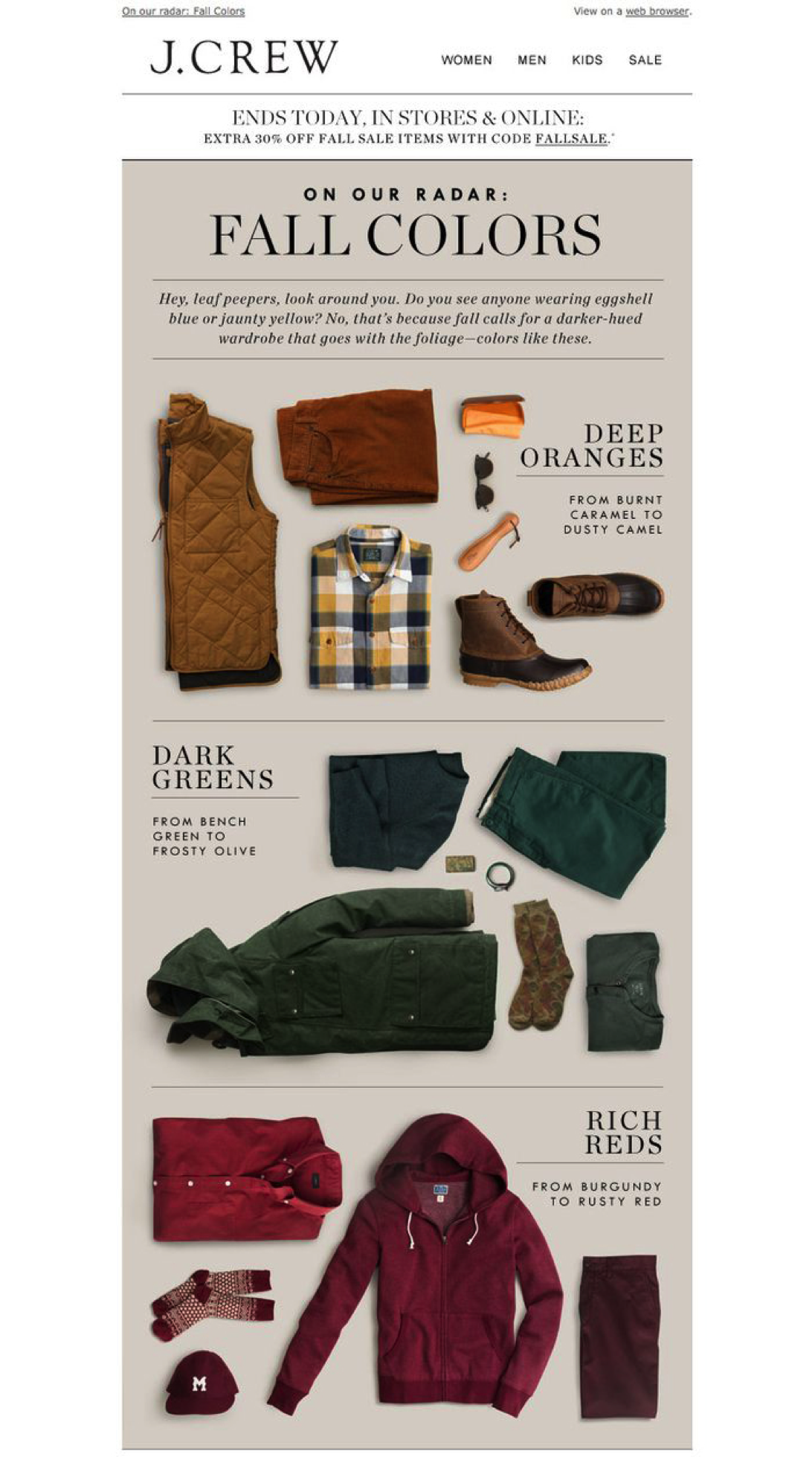 The subject line states: “Autumn colors”. Then, through the images, three colors are shown that are the trend for this fall: dark greens, deep oranges and rich reds.