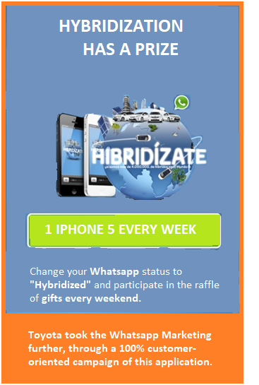Another great example of Whatsapp Marketing is the case of the Toyota Company, which in 2012 had the brilliant idea to take advantage of one of the functions of Whatsapp to promote their proposal through a contest. To participate, people should have put the word “Hybridized” in their Whatsapp Status.