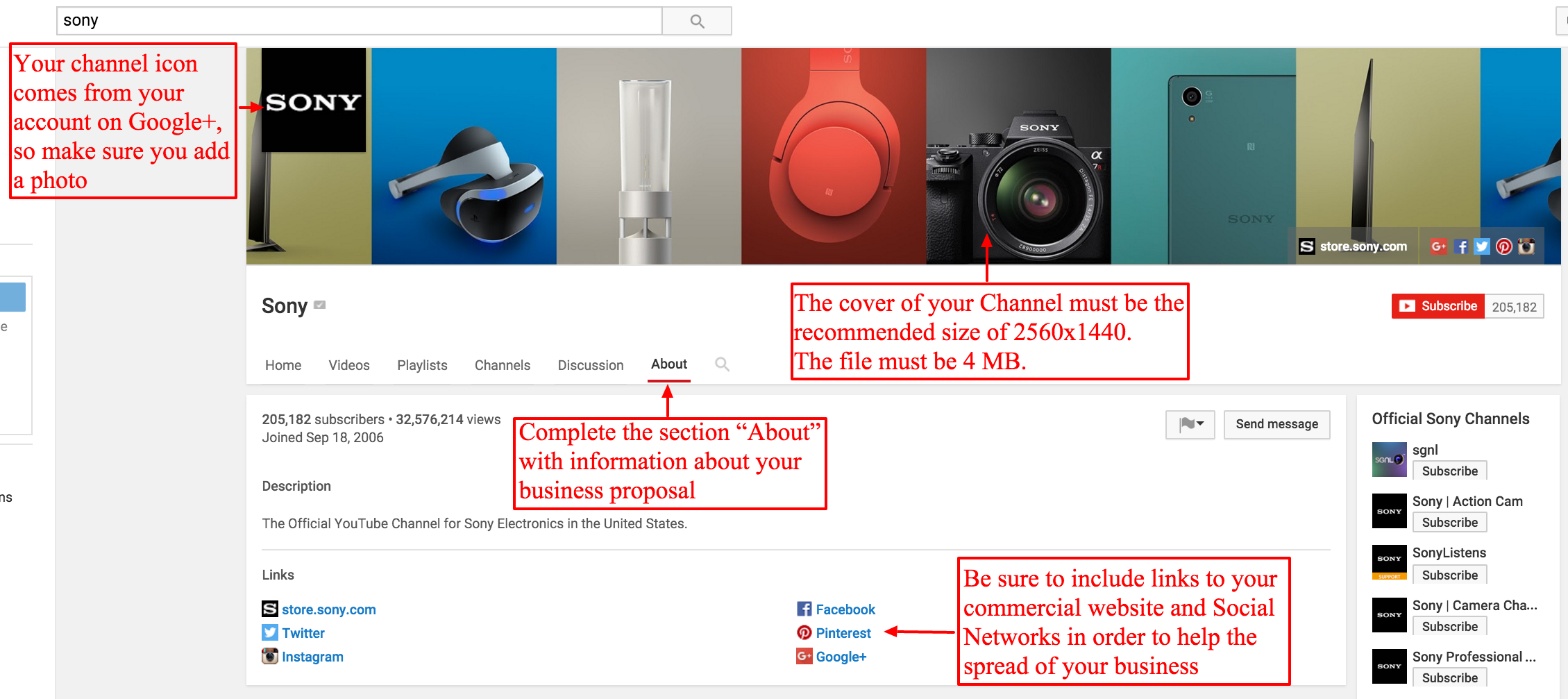 Complete the information on your YouTube Channel with images, links and data