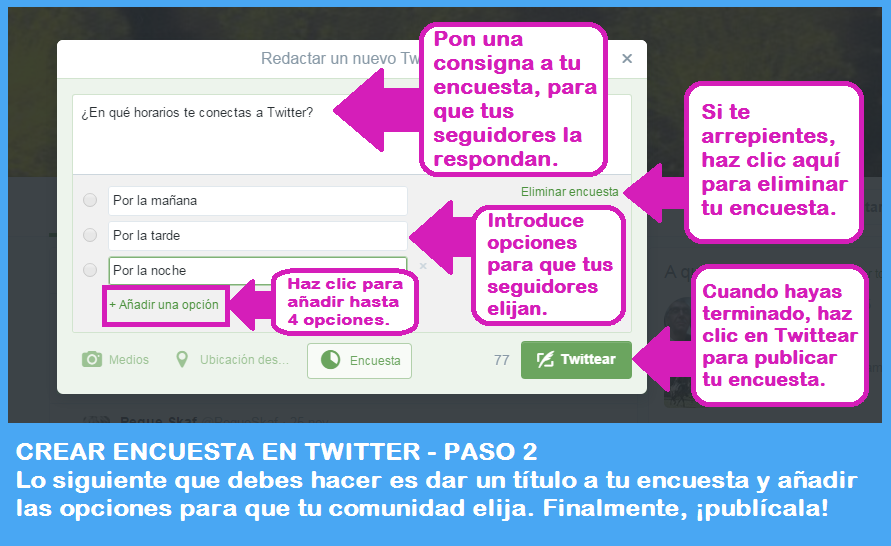 Enseguida se desplegarán una serie de campos que deberás rellenar con la consigna de la encuesta y con las respuestas entre las cuales podrán escoger tus seguidores. Ten en cuenta que, hasta el momento, Twitter sólo permite añadir hasta cuatro posibles respuestas. Una vez que tu encuesta esté lista, simplemente debes pulsar el botón de “Twittear” y voilà! Ya puedes comenzar a obtener datos y a entretener a tu audiencia, ¡todo a la vez!