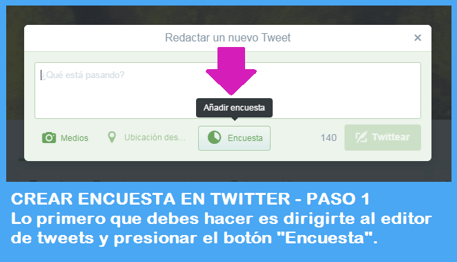 Crear encuestas en Twitter es muy sencillo. Como puedes ver en la imagen de abajo, lo primero que debes hacer es dirigirte a tu cuenta de Twitter y hacer clic en el botón para redactar tweets. A continuación, tienes que presionar el botón “Encuesta”, como se muestra en la captura siguiente.