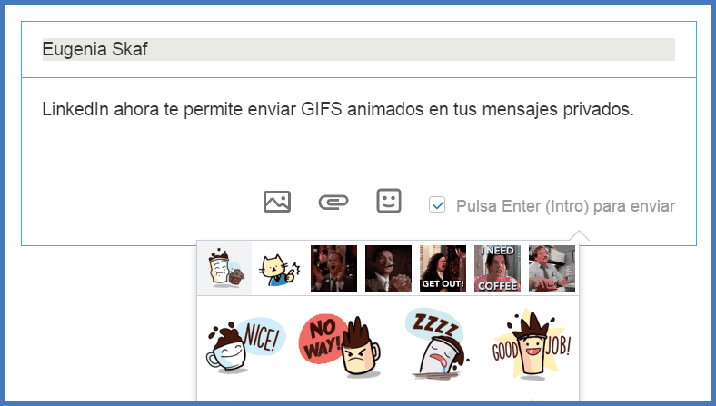 Siguiendo una marcada tendencia iniciada por Facebook, LinkedIn se suma a la fiebre de los GIFS animados en las Redes Sociales y ahora permite a sus usuarios enviar dichas imágenes en movimiento vía Mensaje Privado. En consecuencia, ya puedes enviar GIFS a tus contactos de LinkedIn a través del chat para animar tus conversaciones.
