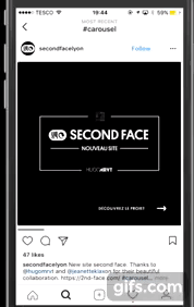 El Carrusel de Instagram te permite usar solo fotos o solo videos. O una combinación de ambas cosas. Por lo general resulta más fácil utilizar solo fotos. ¡Anímate a integrar video! En el ejemplo, la marca Second Face Lyon utiliza video para mostrar su nuevo sitio web y agrega una flecha animada para indicarle a los seguidores que deben deslizar la imagen para seguir viendo.