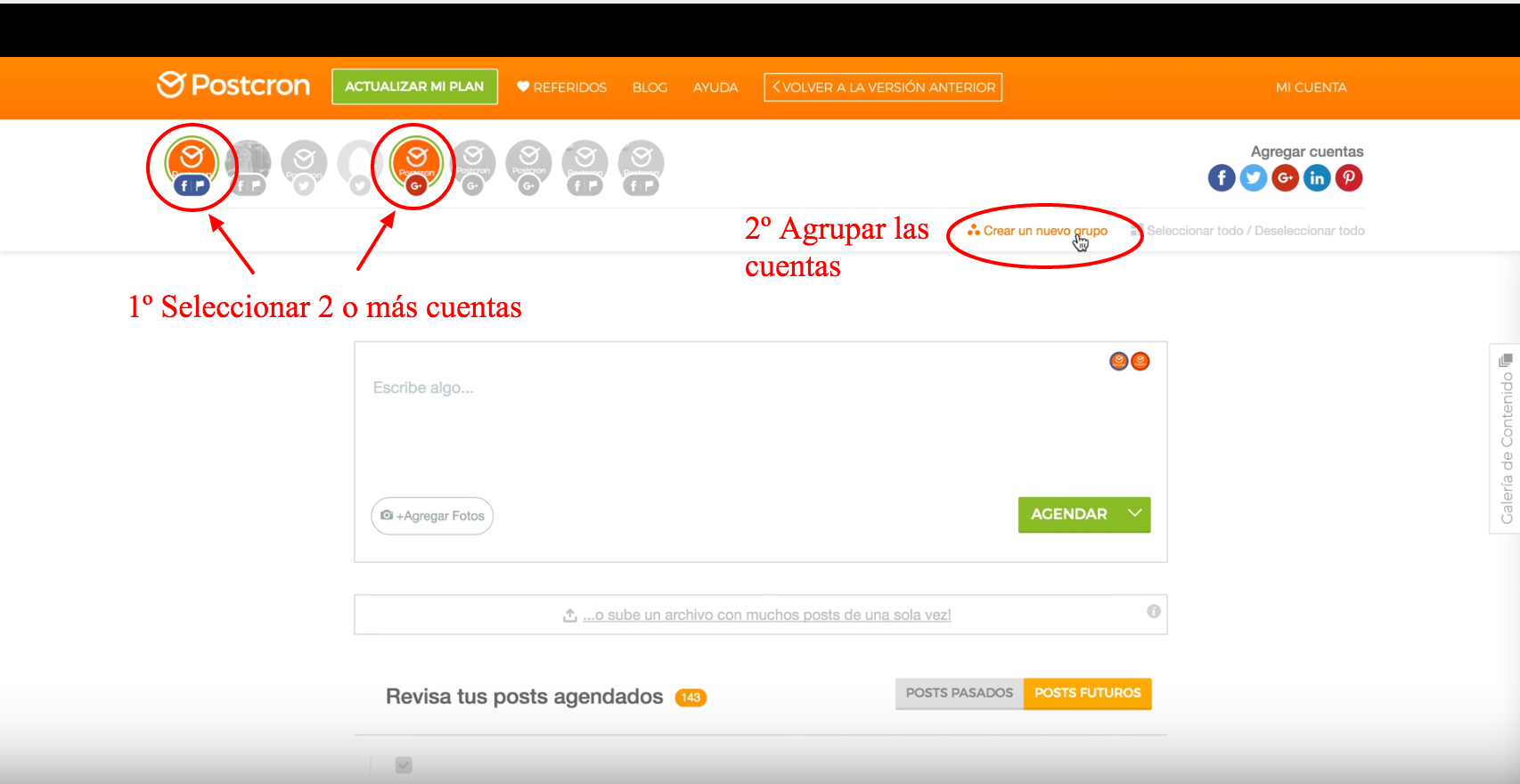 - Puedes agrupar las cuentas que manejas por Red Social (Facebook, Twitter, Google+).