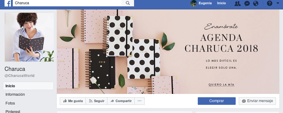 Se trata de Charuca, una marca de venta de productos de papelería y papelterapia. Su portada está desarrollada de una manera muy inteligente. En su foto de perfil está la creadora de la marca, Charuca. Tiene entre sus manos uno de sus productos. La portada promociona la venta de la Agenda Charuca del año. El texto refuerza la venta. Los colores combinan con todo el espacio visual. Es llamativa, tiene texto, pero no molesta.