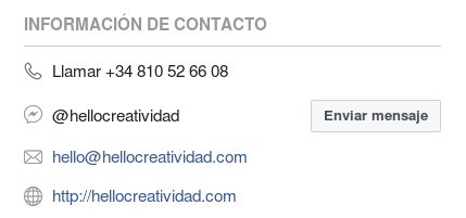 El siguiente ejemplo corresponde a la “Información de Contacto” de un espacio virtual dedicado a los cursos online en torno a la creatividad.