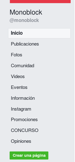 Por defecto, Facebook provee a tu fanpage de una barra lateral con opciones standard: Inicio, publicaciones, fotos, opiniones, eventos. Esta barra también varía en función de la categoría de tu página. Lo más interesante es que tienes la posibilidad de personalizarla.