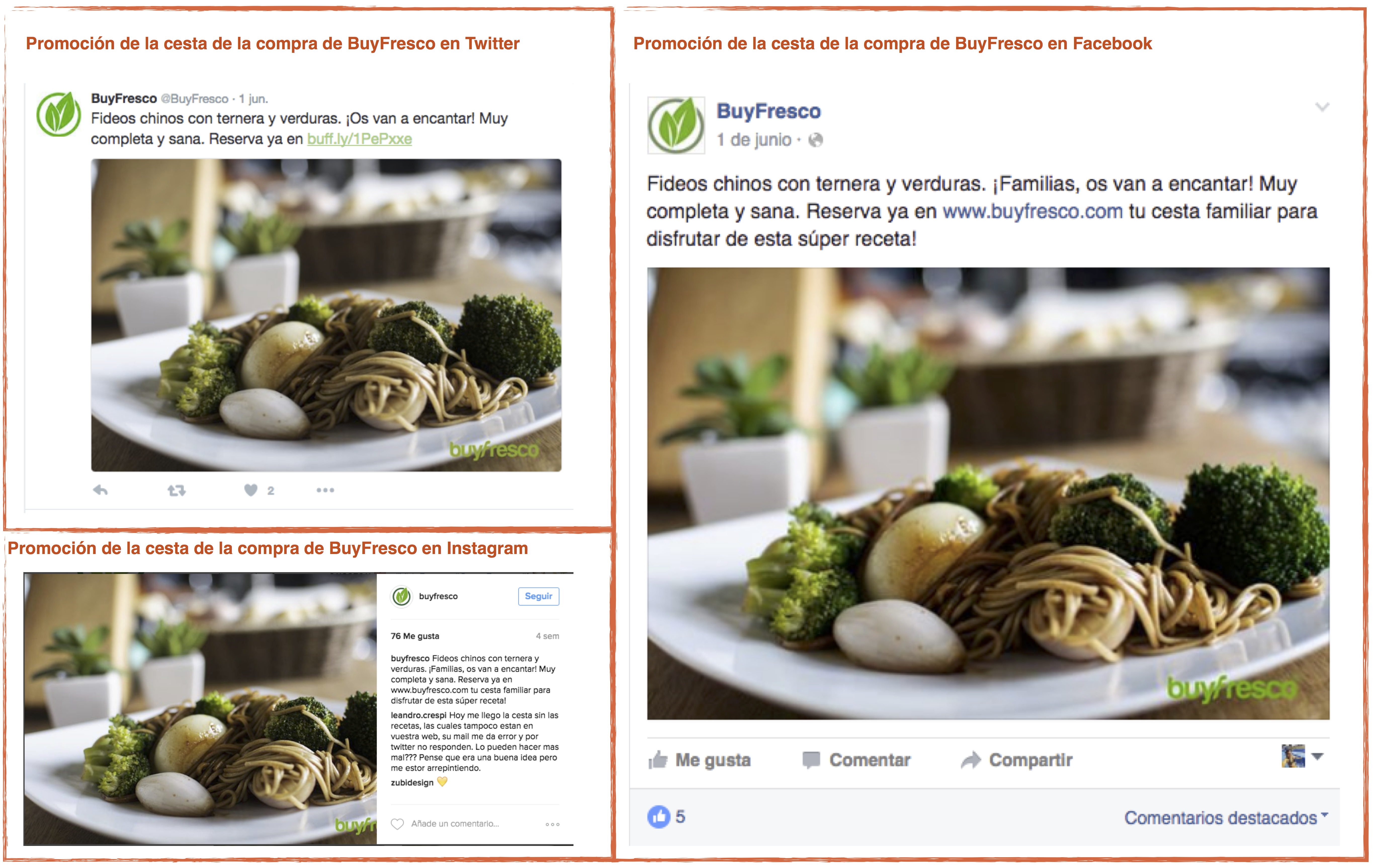 Pues bien, eso es justo lo que hace BuyFresco, una plataforma digital de productos de alimentación que muchas veces publica la misma campaña en sus diferentes perfiles sociales insertando códigos UTM para poder saber en cuál de ellas la publicación funcionó mejor: