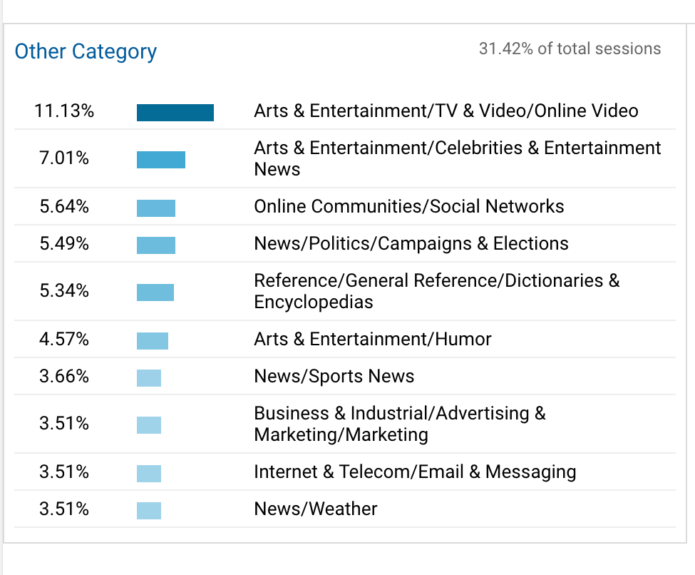 Este recuadro muestra los intereses de la audiencia. Esto tiene más que ver con lo psicográfico. Se trata de las “Categorías de Afinidad”. Y también está disponible el “Segmentos In-Market”, que te ayudará a analizar dónde están tus usuarios en sus jornadas de compra.