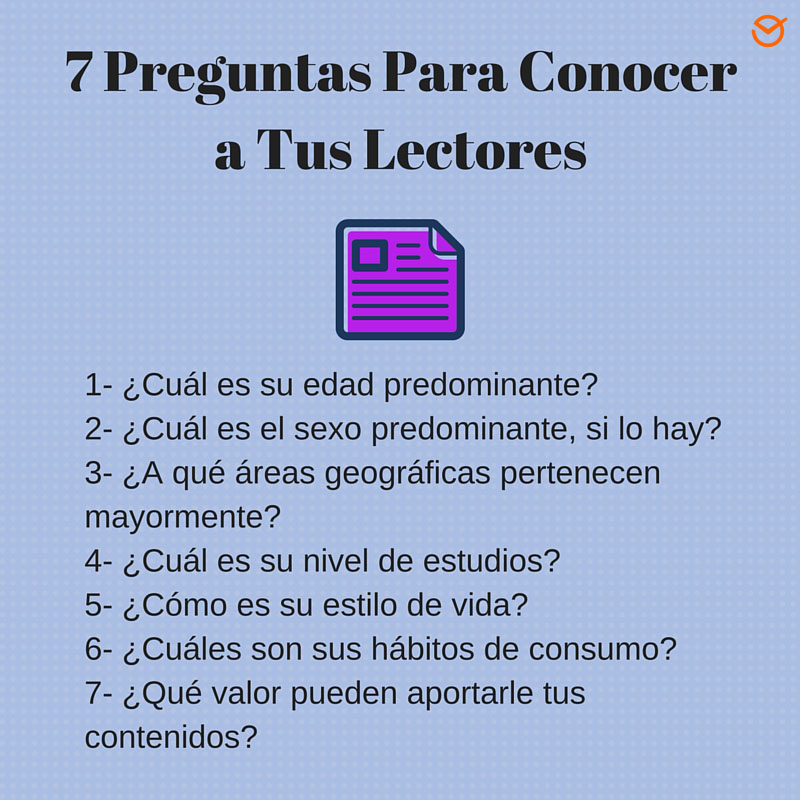 Por ejemplo, si descubres que el grueso de tu público son personas mayores, entonces deberás adaptar tus contenidos a dicha audiencia y omitir referencias dirigidas a adolescentes o a públicos demasiado específicos. Así, para conocer a tus lectores te sugiero responder a las siguientes preguntas: