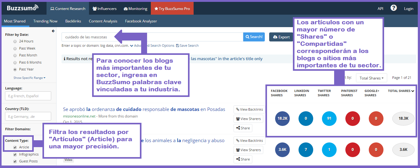 Para hallar blogs importantes vinculados a tu área de actividad puedes ingresar en el buscador de BuzzSumo palabras clave relacionadas a tu sector (por ejemplo, si tienes una tienda para mascotas puedes buscar “cuidado de las mascotas”) y filtrar los resultados por “Artículos”.