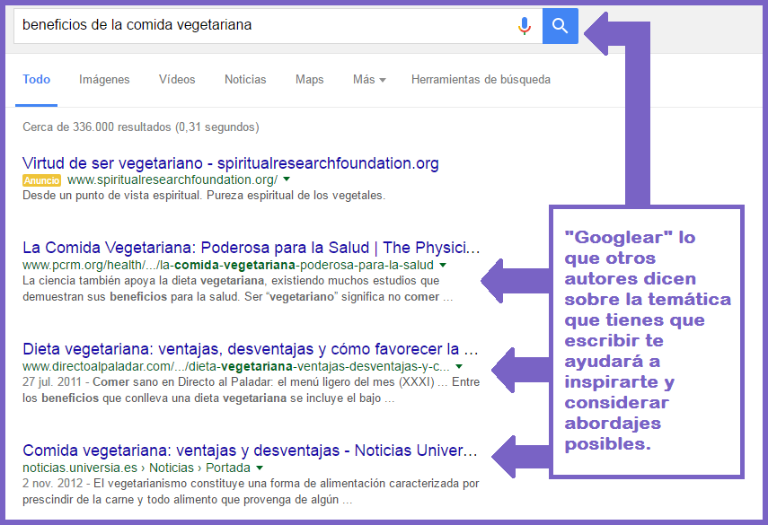 Echar un vistazo a lo que otros autores dicen sobre la temática que debes escribir te dará un panorama de los abordajes posibles y te inspirará para formular tus propias aproximaciones. Por ejemplo, si tienes que escribir sobre comida vegetariana, puedes buscar “beneficios de la comida vegetariana” y explorar los enlaces resultantes.