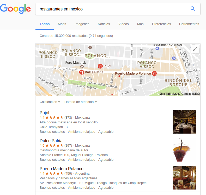 Uno de ellos es Pigeon, un algoritmo que pasó a priorizar resultados en la SERP de acuerdo con la ubicación del usuario, exhibiendo informaciones como comentarios de otros usuarios, distancia, precio, dirección, contactos, entre otras informaciones.