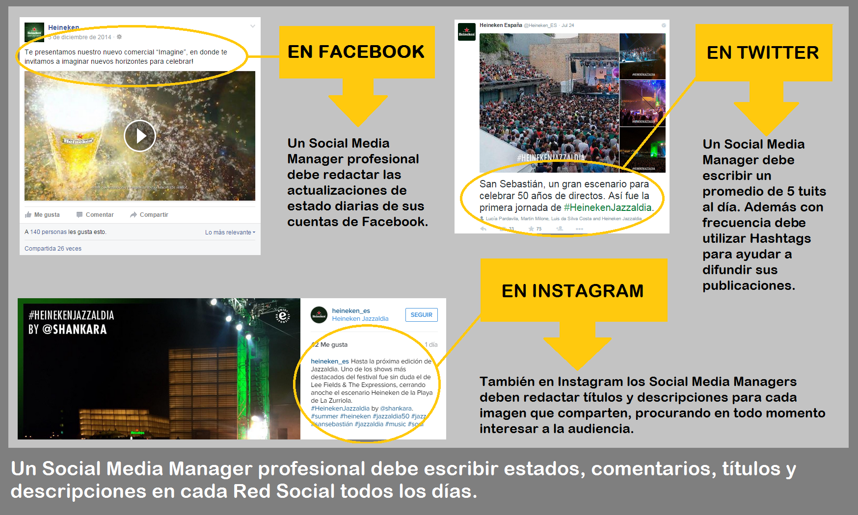 Así, llevar adelante cualquier campaña de comunicación en las Redes Sociales siempre implica escribir. Ya sea que se trate de titular un vídeo en Vine o colocar un pie de foto en Instagram, lo cierto es que el profesional encargado de esas tareas deberá contar con destrezas para redactar. Y es que un estado bien escrito, con verbos y adjetivos certeramente elegidos, tiene muchas más posibilidades de provocar en la audiencia la reacción deseada (hacer clic, compartir el contenido, etc) que otro redactado pobremente. En la imagen de abajo puedes ver algunos ejemplos del trabajo de escritura de un Social Media Manager en algunas Redes Sociales.