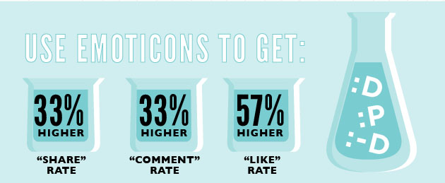 - No es un juego de niños. Que tus posts incluyan emoticones, ya que puedes obtener 57% más de likes. De acuerdo al AMEX OPEN Forum infográfico: