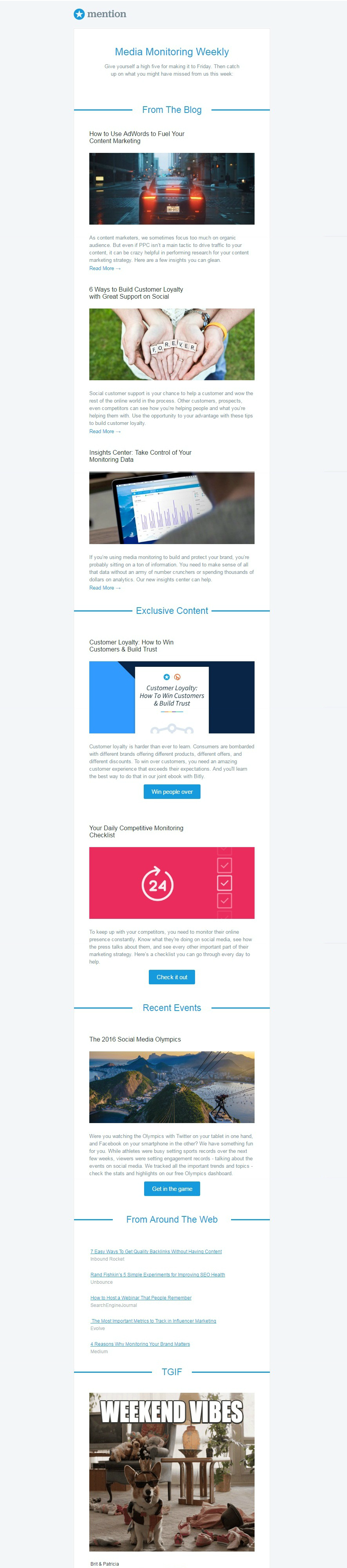 Mention, una de las herramientas de monitorización de menciones más populares, respeta muy bien este criterio en su e-mail newsletter, ya que tanto sus blogposts como sus recursos no apuntan directamente a la venta (o en su caso, a apuntarse a su versión paga):