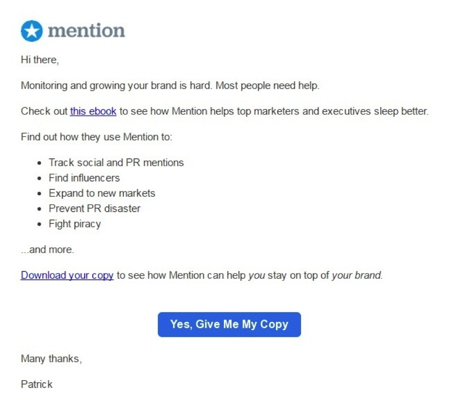Este criterio también es aplicado por Mention. Por ejemplo, este e-mail de contenido llegó a mi inbox una vez suscripta a su newsletter y días después de haber asistido a un webinar de ellos. En él me invitan a descargar un ebook “para ver cómo Mention ayuda a marketineros top y ejecutivos a dormir mejor”: