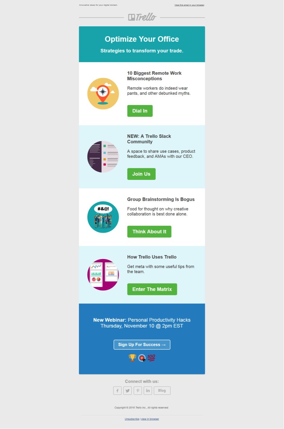 Más allá de otorgarles previsibilidad a tus lectores, fijar expectativas claras te ayudará a disminuir tus tasas de desuscripciones, a la vez que evitarás ser reportado como spam.