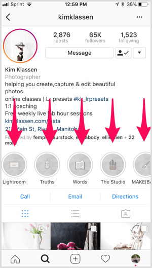 En cambio, el ejemplo que sigue está mucho más cerca de lo que deberíamos lograr con las Highlights de Instagram. Se trata del perfil de una fotógrafa profesional.