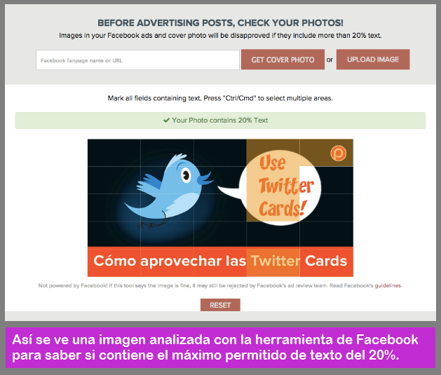Por otro lado, Facebook exige un máximo del 20% de texto en imágenes promocionales, por lo que si planeas utilizarlas, te aconsejo emplear esta sencilla herramienta para medir tus imágenes para publicar.