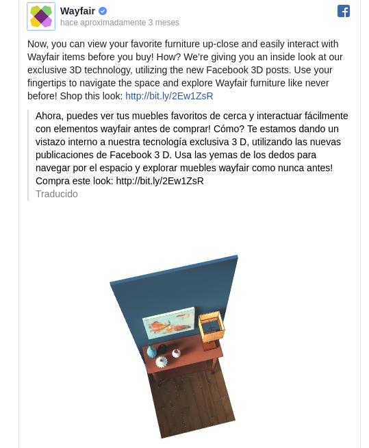 La llegada a pleno de la AR en Facebook no solo se limita a Messenger. Es una característica que se podrá disfrutar en toda la plataforma. Es decir, en tu feed de noticias vas a poder ver publicaciones interactivas en 3D de los productos que te interesan.