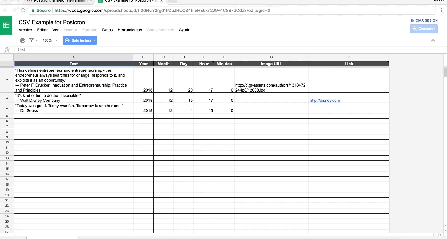 En la columna G colocas un enlace a una imagen que quieres que acompañe tu post (la imagen tiene que tener extensión JPG o PNG para que sea agendada correctamente).