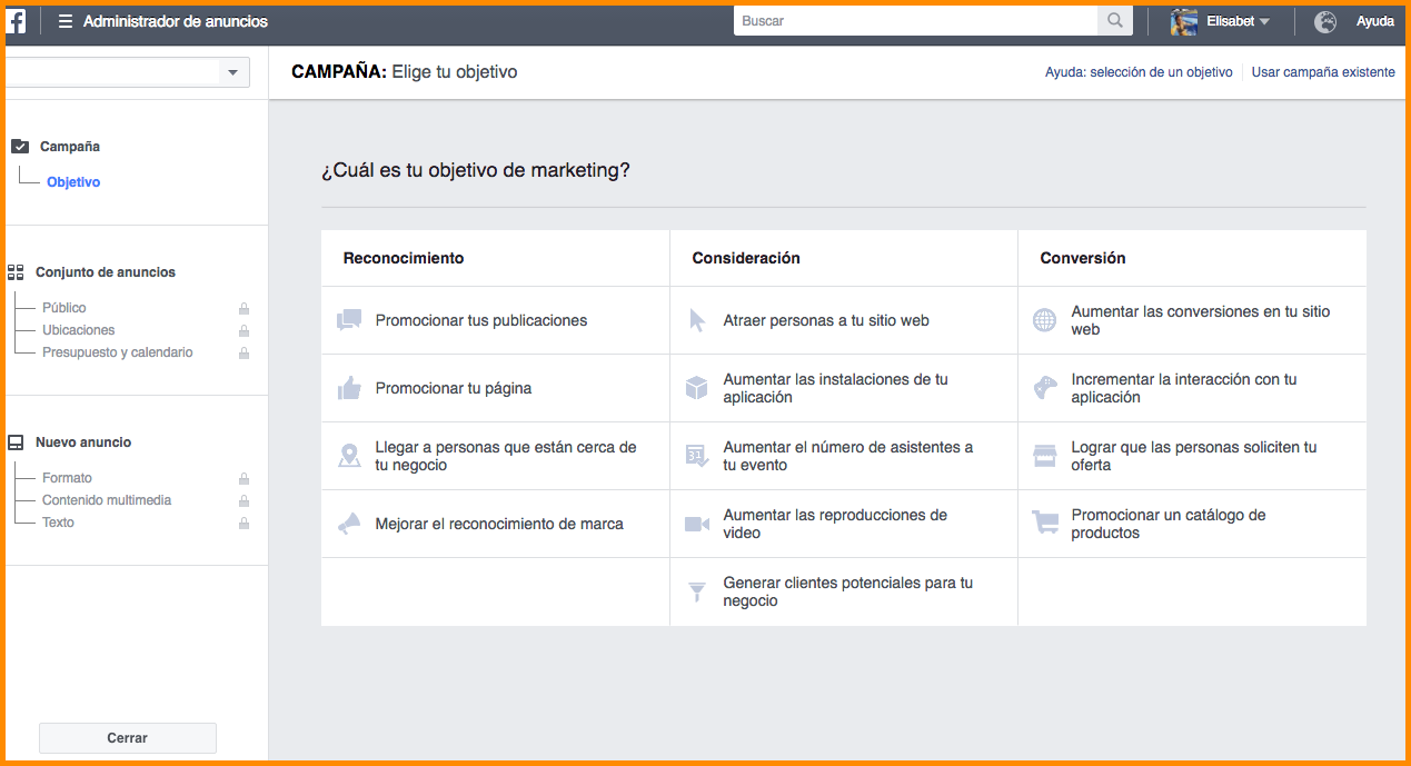 Y si te faltan ideas no te preocupes, porque la plataforma te da hasta varios objetivos de marketing cuando comienzas a configurar tu campaña publicitaria:
