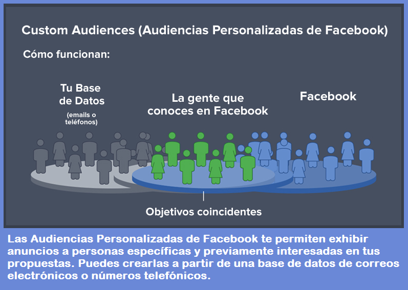 Como dijimos al inicio de este post, Facebook se ha optimizado en los últimos años para brindar las mejores oportunidades a los anunciantes. Esto incluye la posibilidad de publicitar en Facebook con un grado de segmentación (y efectividad) más alto que nunca, a través de las Audiencias Personalizadas (Custom Audiences).
