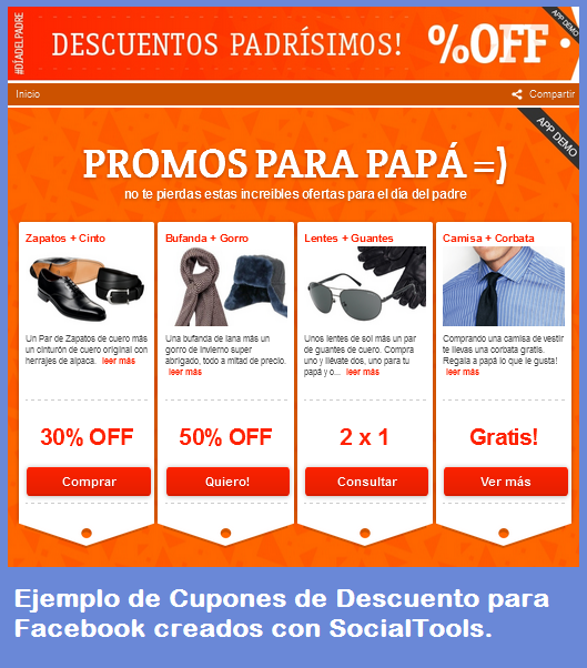 - Ofrece cupones de descuento exclusivos para tus fans: puedes activar esta posibilidad creando una aplicación de cupones de descuento. Allí tendrás la posibilidad de ofrecer a tus seguidores en Facebook un descuento exclusivo (desde un pase libre hasta una rebaja porcentual en el precio total) para comprar tus productos o servicios.Las ventajas de recurrir a esta técnica son múltiples: por una parte, te sirve para llevar a personas dispuestas a comprar a tu negocio físico o tienda online. Por otro lado, al ser un beneficio exclusivo para fans te ayuda a sumar nuevos seguidores y a fidelizar a aquellos que ya siguen tu marca en Facebook.