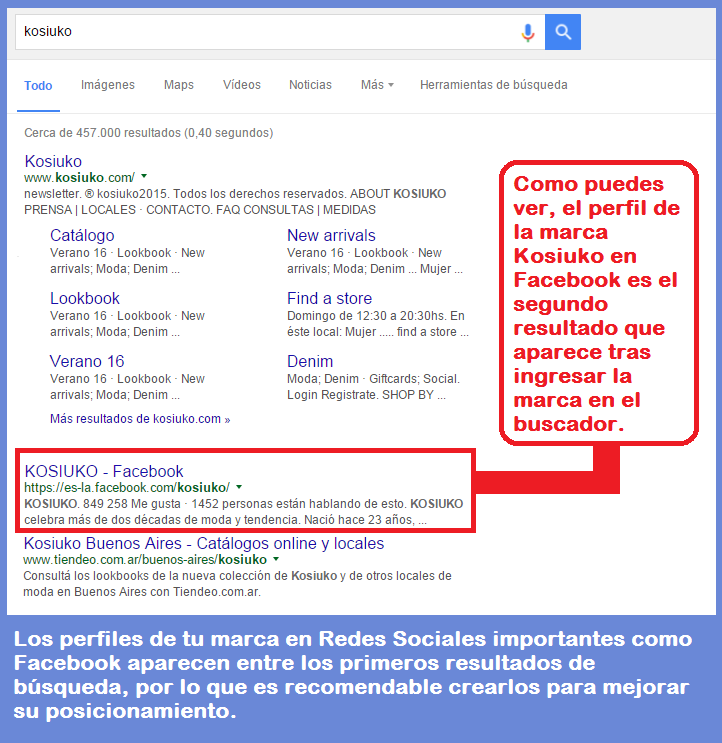 Los perfiles de las Redes Sociales aparecen siempre entre los primeros resultados de búsqueda, razón por la cual debes asegurarte de que tu marca posea cuentas al menos en Facebook, Twitter, LinkedIn y Google+. Ello favorecerá tu posicionamiento SEO y te ayudará a convencer a tus potenciales compradores de que tu marca es confiable y accesible (¡justamente porque pueden explorar tus perfiles e interactuar contigo en las Redes Sociales!).