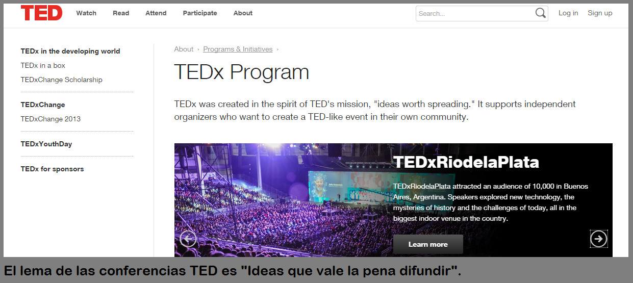 Un buen ejemplo de conferencias online son las miles que anualmente se ofrecen en todo el mundo como parte de la organización TED, con el objeto de difundir ideas que valen la pena. Muchas de ellas incluso son llevadas a cabo de manera independiente, pero con el mismo espíritu, bajo el nombre de TEDx. Las temáticas son muy variadas, generalmente motivacionales y son dictadas por los mejores representantes de cada campo. Te aconsejo que visites la página de TED de tu ciudad para enterarte de los contenidos disponibles.