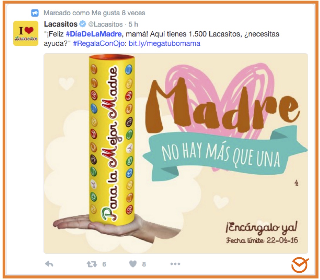 Por ejemplo, en muchos países está por celebrarse el Día de la Madre con lo cual muchas empresas están apostando por dar a conocer sus productos y servicios empleando el hashtag #DíaDeLaMadre para así interactuar con aquellos usuarios que están realizando búsquedas relacionadas con esta etiqueta como el caso de la marca de grageas de chocolate Lacasitos.