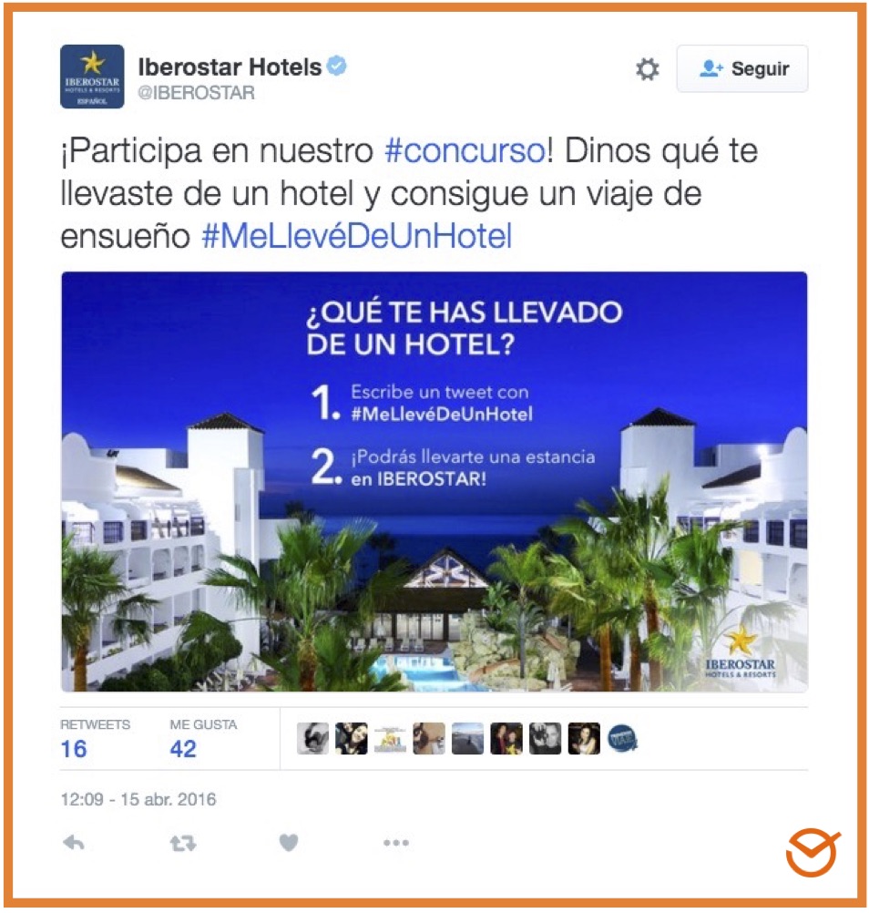 Un buen ejemplo de concurso es el que está lanzando ahora la cadena de hoteles Iberostar, que mediante el hashtag #MeLlevéDeUnHotel invita a las personas a compartir anécdotas divertidas acerca de objetos que se llevaron de los hoteles —lo que da un toque de cercanía y humor— y además incorpora etiquetas —ya no solo #MeLlevéDeUnHotel sino también #concurso en sí— y todo ello con la oportunidad de ganar una estancia en alguno de sus hoteles y resorts.